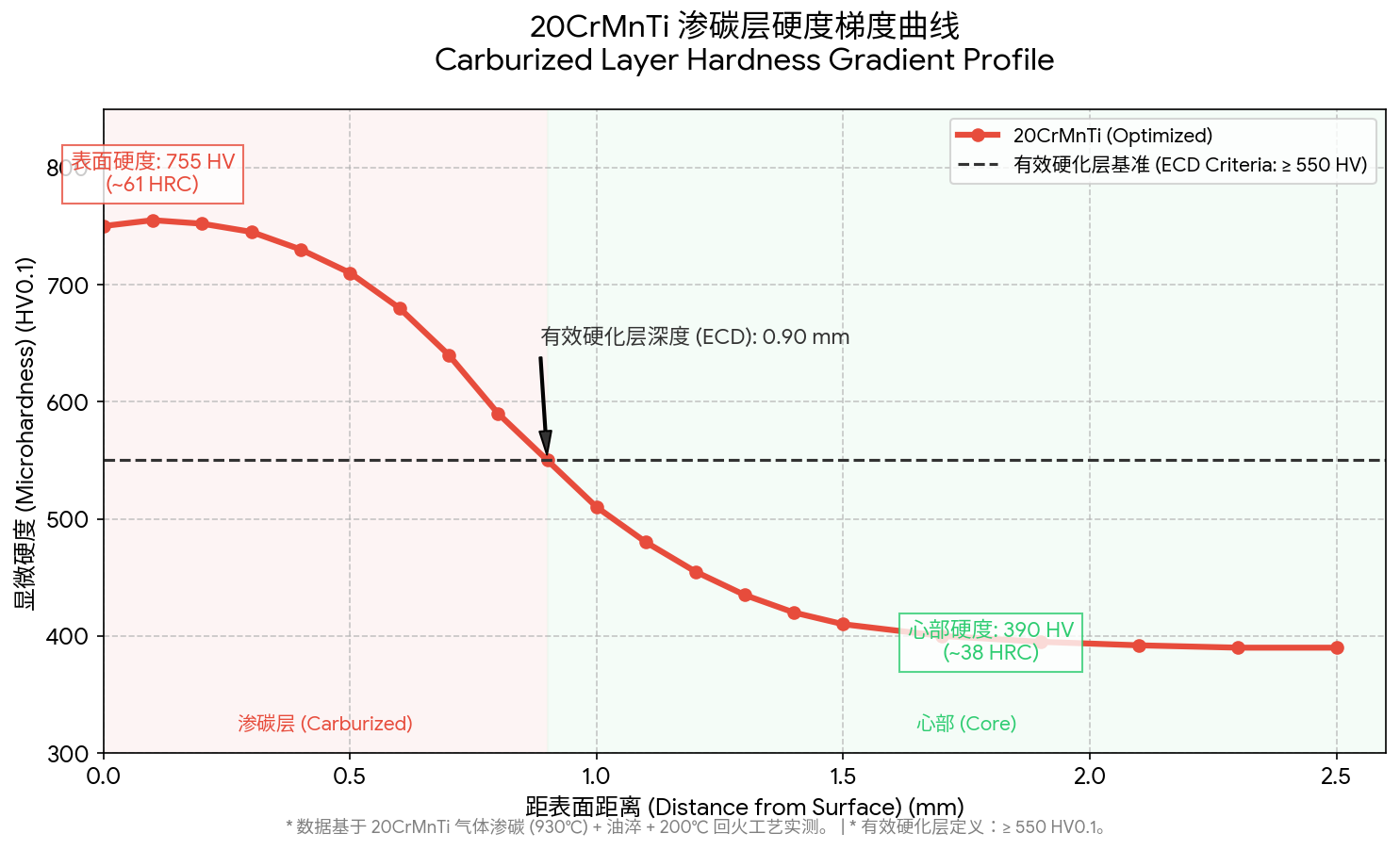 渗碳工艺是 20CrMnTi 的灵魂。工艺要点:在 900~930℃ 下进行气体渗碳,将表面碳含量提升至 0.8~1.0%。