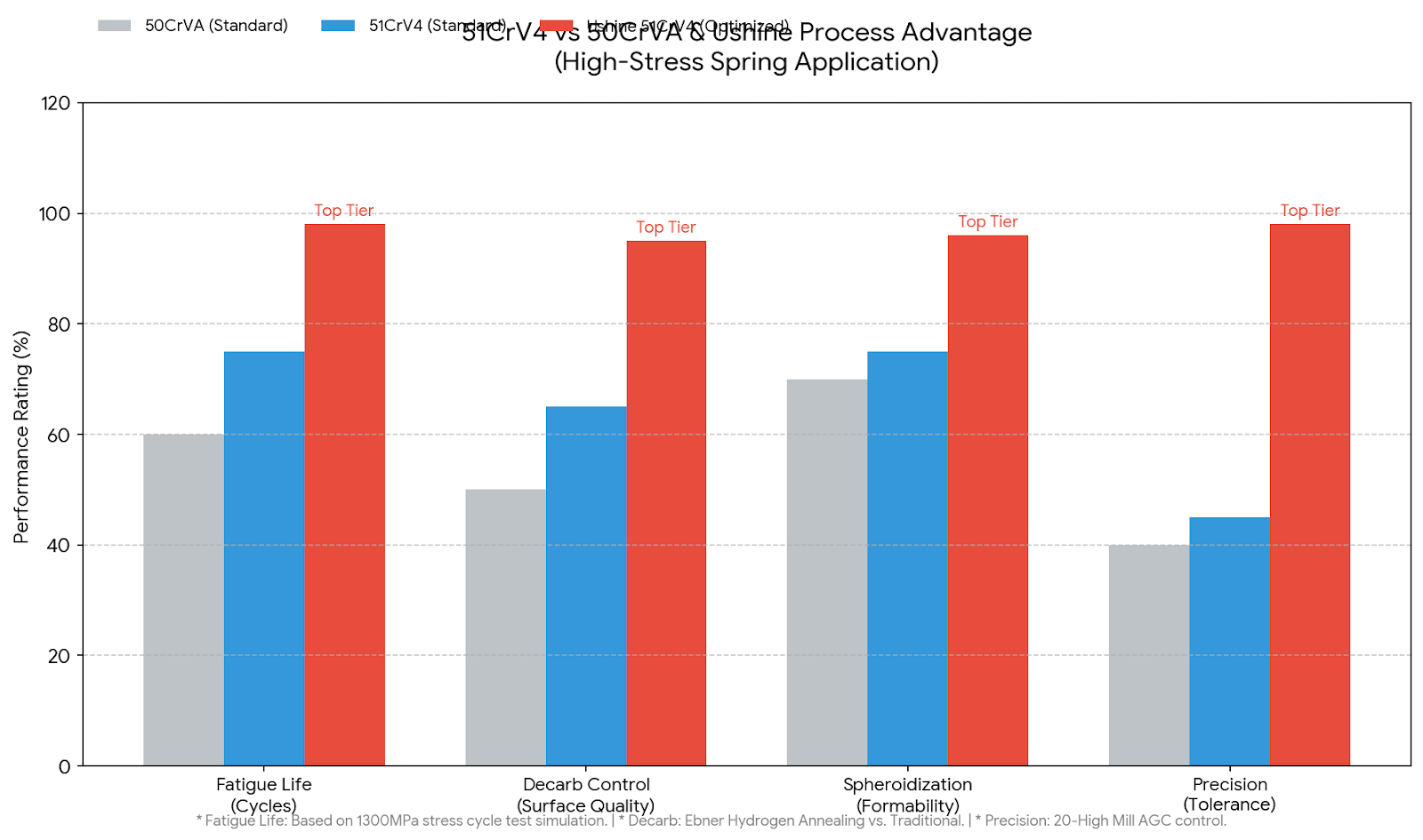 如图所示,虽然 51CrV4 在标准数据上略优于 50CrVA,但真正的性能鸿沟在于加工工艺。Ushine(有象)通过对组织和公差的极限控制,让 51CrV4 在高应力疲劳测试中表现出超越标准 40% 以上的稳定性。